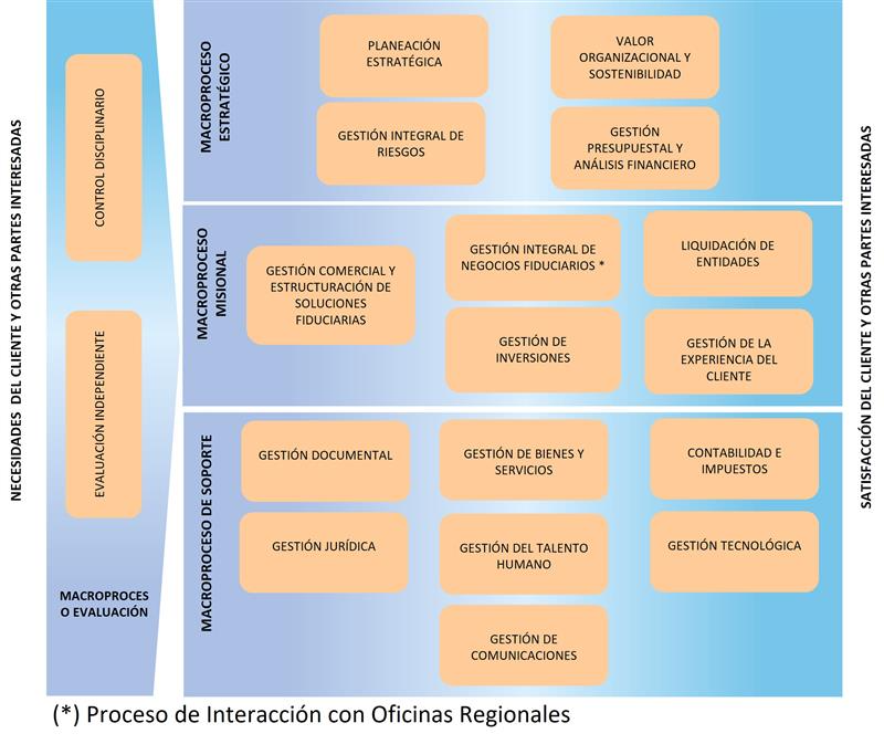 En Fiduprevisora trabajamos para ofrecerte servicios fiduciarios con excelencia y transparencia. Nuestro mapa de procesos es una herramienta que refleja la forma en que organizamos y gestionamos nuestras actividades para cumplir con nuestros objetivos estratégicos. Aquí encontrarás una visión clara y estructurada de cómo garantizamos la calidad, optimización y sostenibilidad en cada uno de nuestros servicios.
